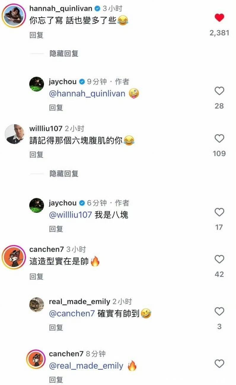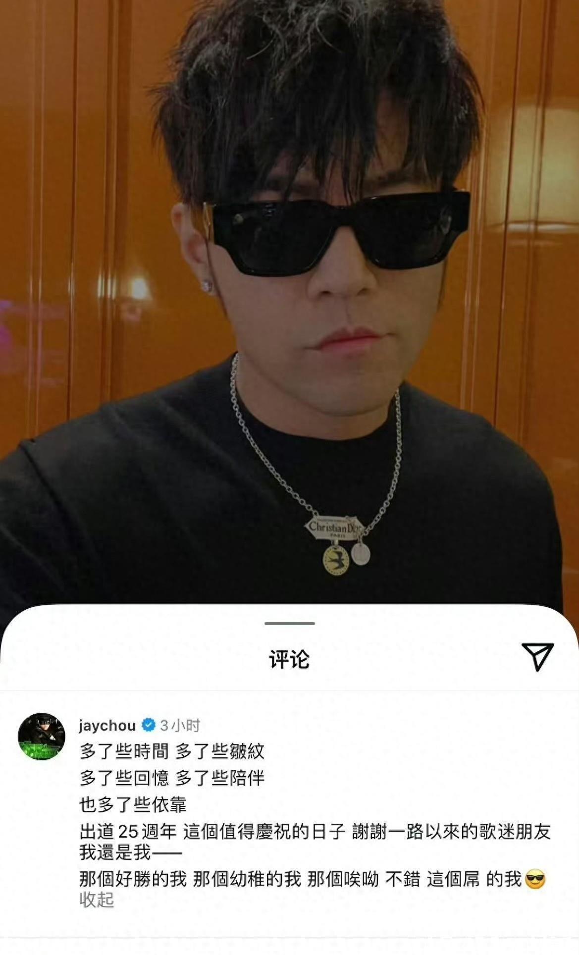 昆凌回复周杰伦:“你忘了写,话也变多了些。”11月6日,出道25周年纪念日,周杰伦在社交媒体总结出道25年的成长,提到自己“多了些时间、皱纹、回忆、陪伴和依靠”,并强调初心未变:“还是那个好胜、幼稚、哎呦不错屌的我”。